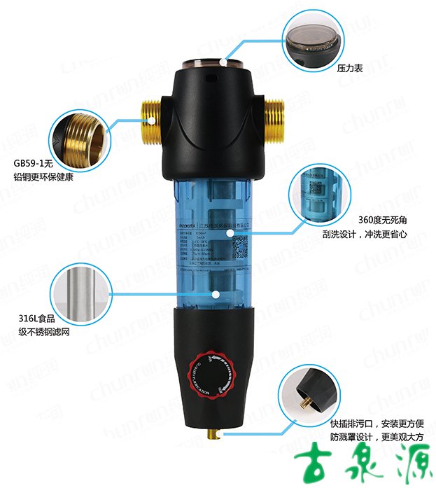 1.排污手柄結(jié)合人體工程學(xué)和視覺美學(xué)完美設(shè)計融合,更美觀實用 2.純潤藍半透明杯體,有效減少光線進入,減少藻類滋生 3.日期刻度記憶功能,方便安全 4.超大杯體,瞬間出水量更大 5.防水錘沖擊設(shè)計,更安全 6.標(biāo)配一寸轉(zhuǎn)6分活接頭 7.5T/小時大流量